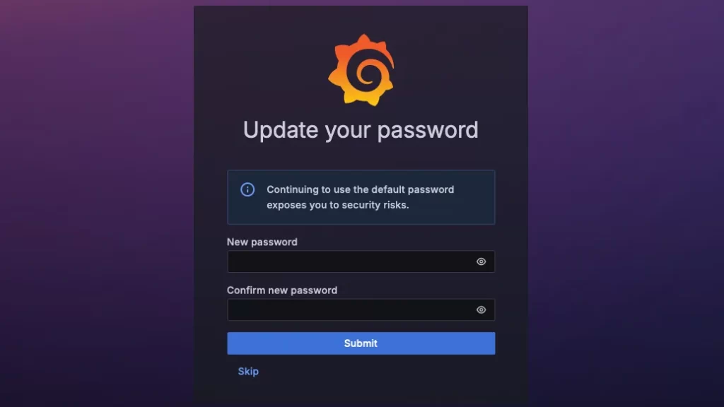 Melden Sie sich bei Grafana mit dem Standardbenutzernamen adminund dem Standardpasswort admin an. Sie werden dann aufgefordert, das Passwort des Administrator-Benutzers zu ändern, und zwar nur beim ersten Mal.
