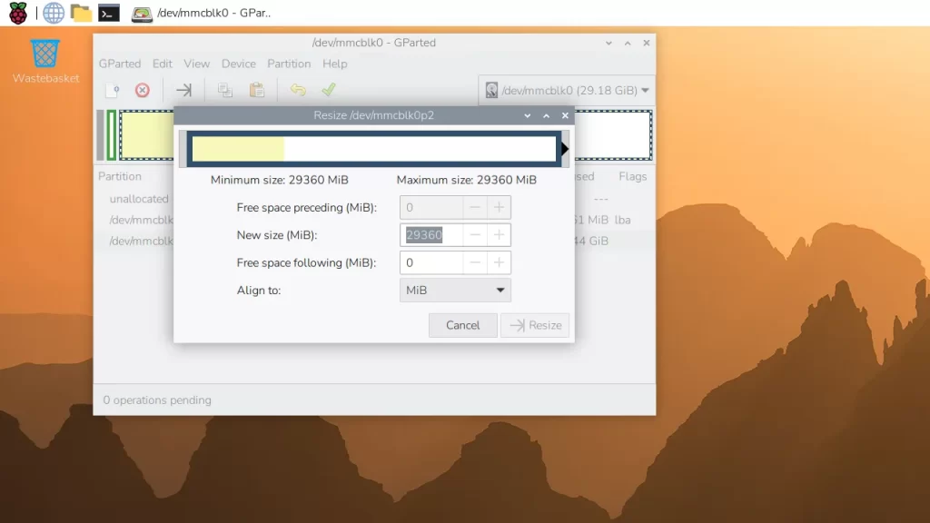 Raspberry Pi はUSB起動もできるため、別のRaspberry Pi OSをUSBメモリーに書き込んでおいて、そこから起動します。USBメモリー側のOSでGpartedをインストールすします。Gparted Liveではありません。