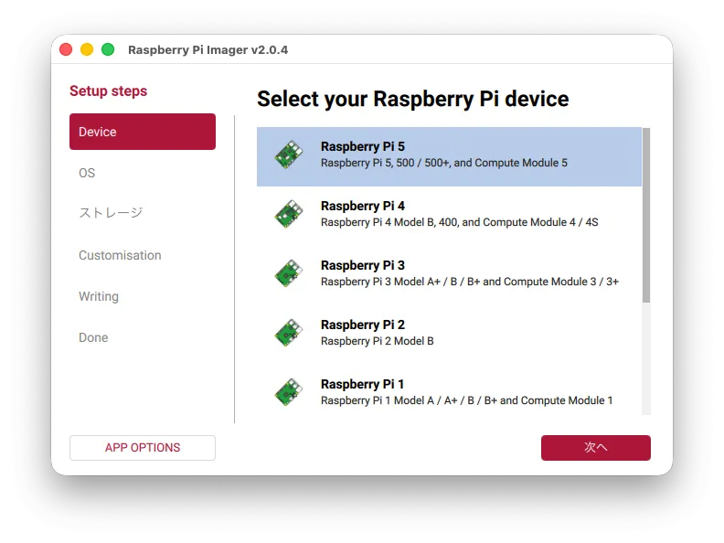 ここでは、Raspberry Pi 5やCM5といったRaspberry Piデバイスで使うOSのため、Raspberry Pi Imagerで書き込んでいます。