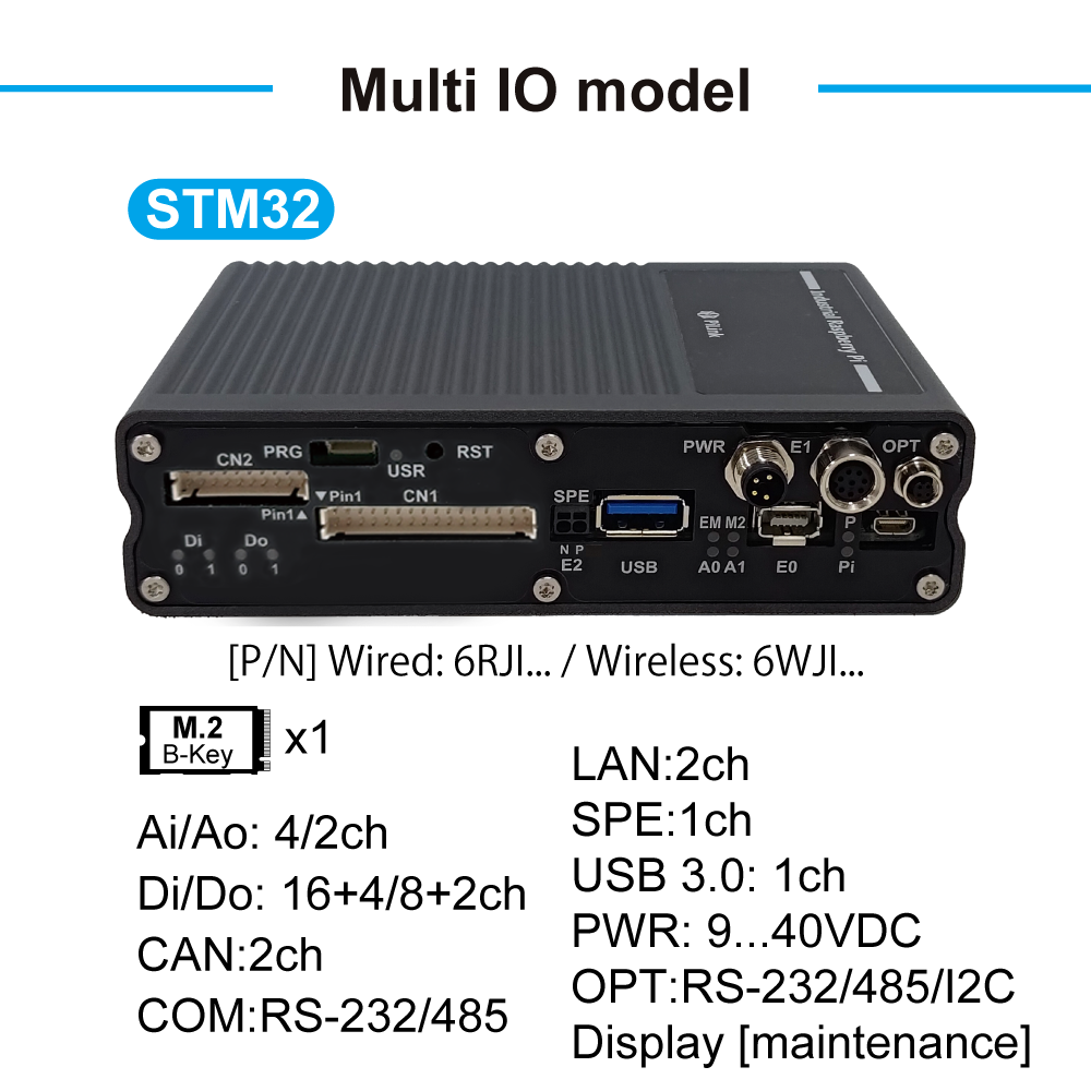 | I/F Front | 1x PWR: Power input, 2-line 2x LAN: GLAN[1000Mbps] x2ch 1x SPE : 10BASE-T1S x1ch 1x OPT : i2c/RS-232/485 selectable 1x USB: USB3.0 Host Type-A 1x CN1: – Di16ch[14ch] (PNP)/2.4mA at 24VDC – Do8ch(PNP)/Pushpull0.1A, High-side0.5A – COM 1ch RS-232/RS485 (half duplex) switching – CAN 1 or 2ch/CAN 2.0B, CAN FD 1Mbps 1x CN2: – Di4ch (NPN)/7.2mA at 24VDC – Do4ch (PNP)/High-side0.5A, pushpull0.1A – Ai 4ch 16bit(0-5/0-10VDC) [Note: ch3 only 0-5/0-100VDC] – Ao 2ch 12bit(0-5/0-10VDC) – SPI 1ch/ Max.12Mbps 1x PRG: STM32 programming port 1x Maintenance: Maintenance Display port(Reserved) [Option]1x WLAN IEEE 802.11 b/g/n/ac, Bluetooth 5.0, BLE [Option]1x LTE(M.2 slot EM7431) |